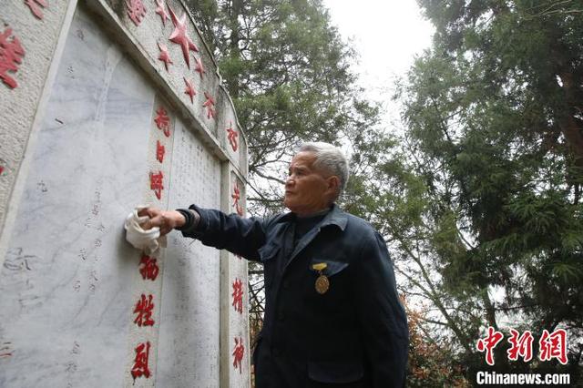 叶官山老人正在用毛巾擦拭烈士墓碑。 李曙 摄