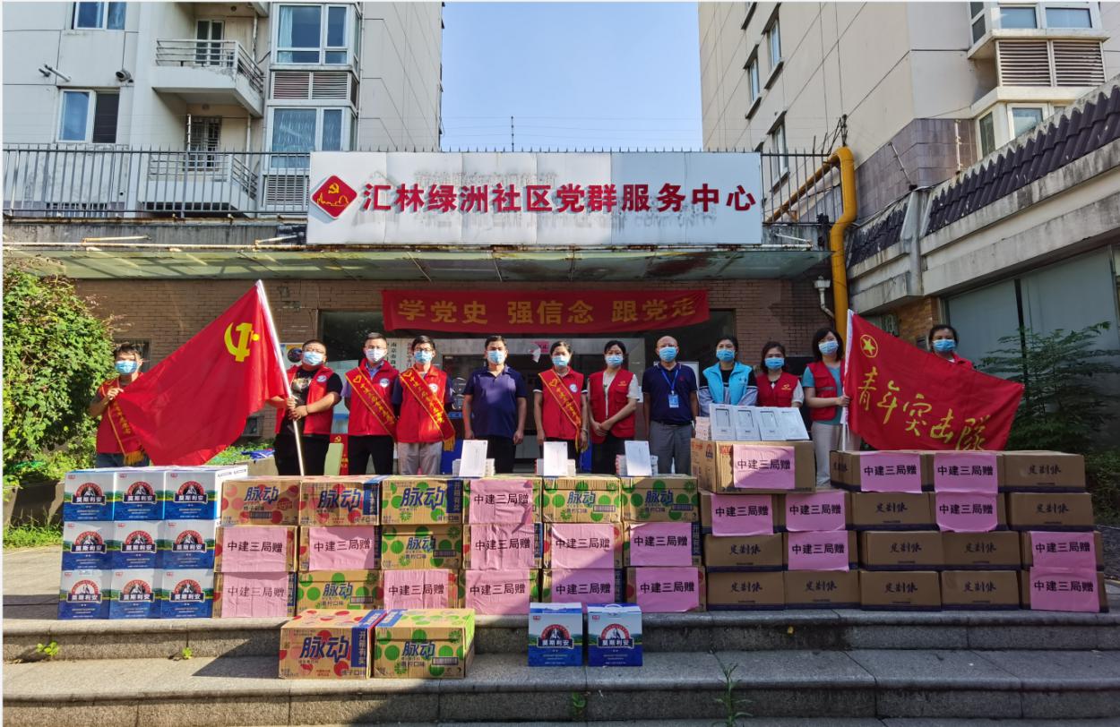 7月31日16:00,中建三局一公司南京2010G59南瑞路项目为南京市鼓楼区中央门街道汇林绿洲社区送去矿泉水、酸奶、脉动、充电宝等物资,慰问抗战在一线的抗疫英雄。