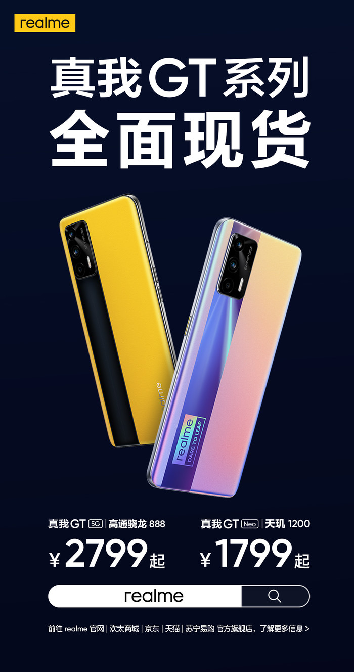 真我GT系列 作为realme今年手机产品线的全新系列,真我GT系列以越级之姿,重塑旗舰定义。独创的速度美学、极致的澎湃性能、可靠的持久耐力让真我GT系列在设计、性能、体验全方位,充分释放高通、联发科双平台最强芯之潜能。立足潮玩设计与越级性能的品牌理念,真我GT系列为用户创造旗舰智能手机的超凡体验。 为年轻人而来 真我GT系列全面现货供应 作为敢越级的科技潮牌,realme一直致力于为全球年轻用户提供兼具越级性能和潮玩设计的产品。真我GT Neo与真我GT起售价分别为1799元与2799元。