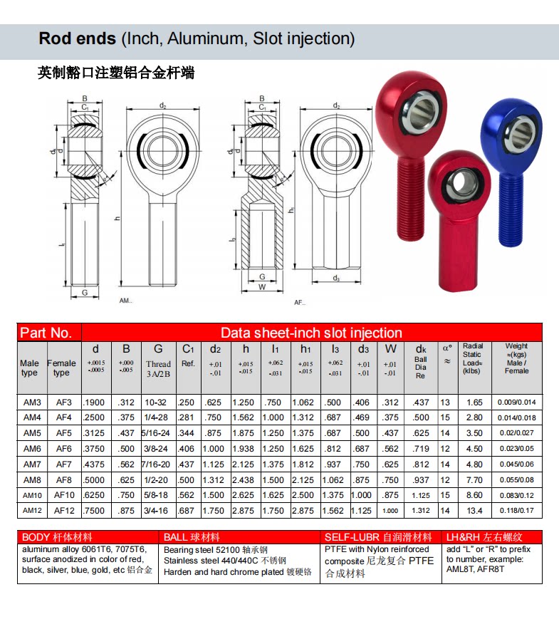 卡瑞森AM8英制1/2-20铝合金6061/7075注塑球头杆端关节鱼眼轴承