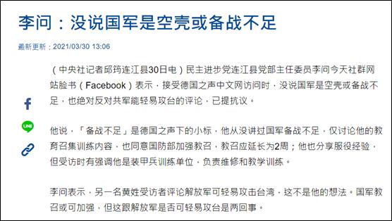 但据笔者查阅,原报道在后文明确指出了“空壳”一说的出处;而从李问对台军的描述看,后者的表现被称“备战不足”实在是恰如其分,看不出什么问题。至于《德国之声》中文网是怎么个“翻译错误”,李问和该媒体都尚未做具体说明。