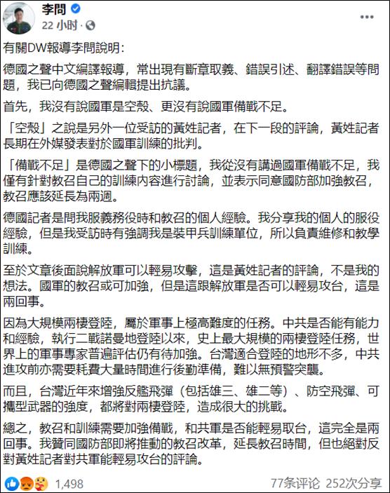 面对岛内一片骂声,李问于30日在网上慌忙回应,称自己从没说台军是“空壳”,该说法来自报道的另一受访者,还表示自己“没有说台军备战不足”。他把引发这次争议的责任完全推卸给了《德国之声》中文网,指责对方“断章取义”、“错误翻译和引述”。