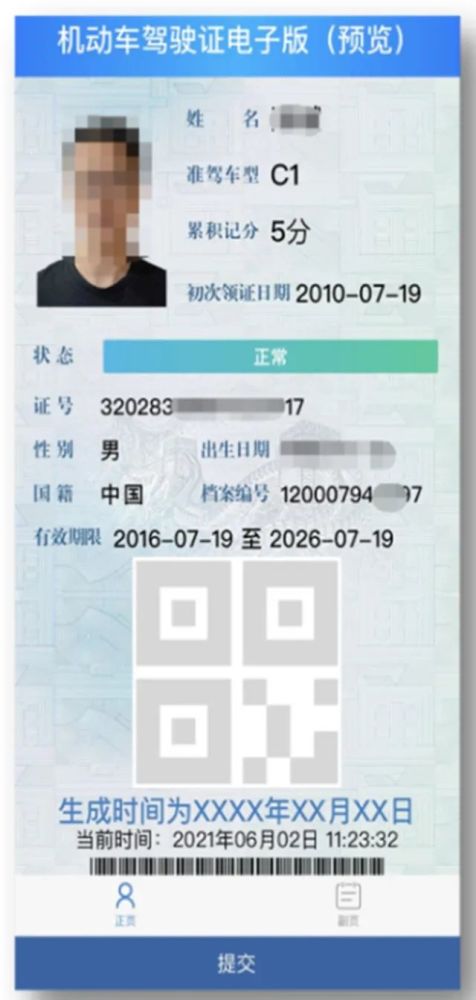 电子驾驶证由正页和副页两部分组成。其中,正页主要包括驾驶证基本信息、电子证生成时间、用于验证信息的二维码和一维码等内容;副页主要包括驾驶人住址、发证机关、驾驶记录以及准驾车型代号规定等内容。